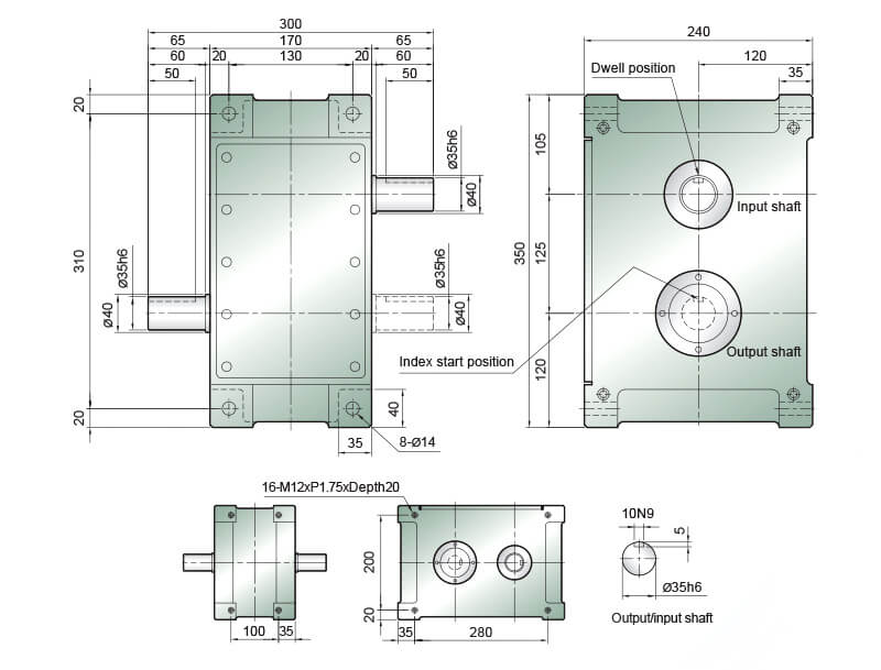 It consists of 2 plate cams fixed to the input shaft and a spider that supports the cam follower to the output shaft. This indexing drive has a plane cam mechanism designed so that the follower contacting the 2 plate cams on the input side serves to transmit rotation to the spider of the output shaft. Best suited for driving conveyors moving at large feed pitches or for intermittent indexing that stops at comparatively long intervals. The another is 3 plate cams designed as heavy load type. It more suits for conveyor rapid moving, stop at more long intervals and larger feed pitches.